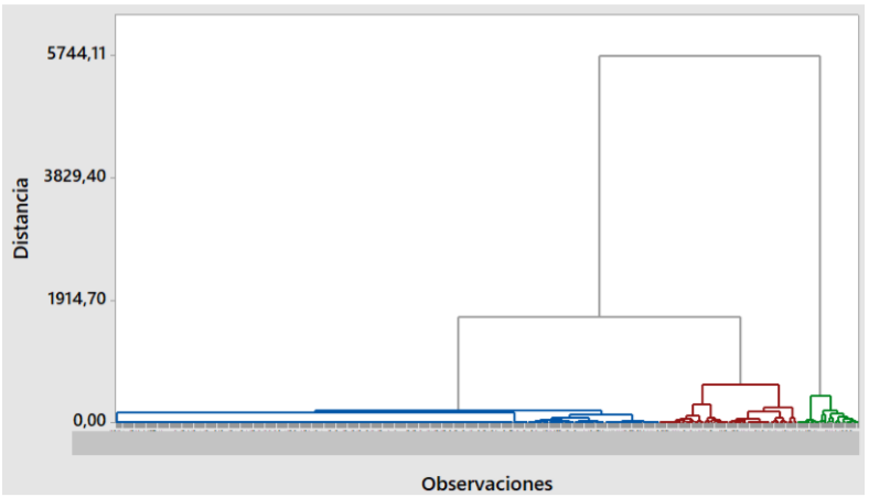 En el análisis de conglomerado, fueron evaluados diferentes criterios de agrupamiento y medidas de similaridad disponibles en el aplicativo de del software Minitab 18, observando los mejores resultados de niveles de homogeneidad intragrupo y heterogeneidad extragrupo con el criterio de agrupamiento Ward y medida de similitud la distancia euclidiana cuadrada con 3 conglomerados, como se puede observar en el dendograma de riesgo suicida en adolescentes escolarizados de la figura 3.
