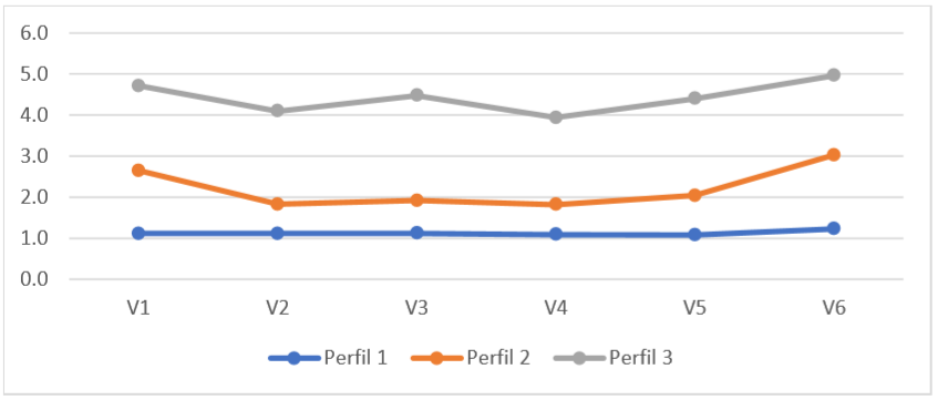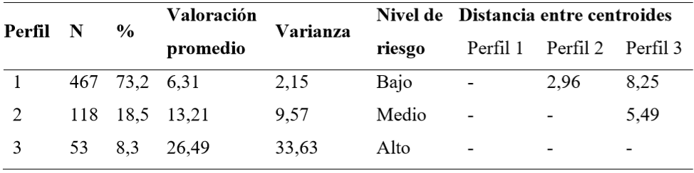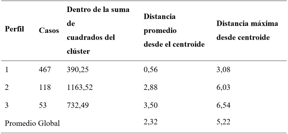 En la Tabla 1 se muestran los resultados de partición final del análisis de conglomerados con 467 observaciones que caracterizan el perfil 1, 118 observaciones en el perfil 2 y 53 observaciones en el perfil 3. La distancia promedio desde el centroide muestra un valor de 2,32 representativa del nivel de homogeneidad intragrupo.