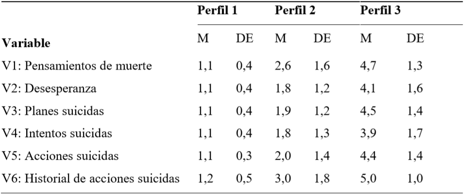 En la Tabla 2 se presentan los resultados en el promedio de puntuación acumulada de las variables por perfil, así como el nivel varianza y resultados de las distancias entre centroides, con nivel de distancia promedio de 5,56 lo cual es representativo del nivel de heterogeneidad extragrupo de los perfiles. Lo anterior permitió clasificar la ideación suicida en nivel bajo, medio y alto en función de la puntuación promedio obtenida por los 3 perfiles, siendo mayor la ideación suicida tanto mayor sea su puntuación.