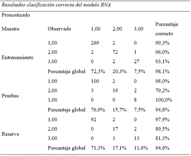 En el proceso de clasificación del modelo de red neuronal artificial de los 638 individuos que hicieron parte de la investigación, 375 individuos se seleccionaron al azar para la muestra de entrenamiento, siendo clasificados correctamente 269 en el perfil 1, 72 en el perfil 2 y 27 en el perfil 3, con lo que se alcanzó un 98,1% de clasificación correcta. Así mismo, 134 individuos formaron la muestra de prueba, siendo clasificados correctamente 100 en el perfil1,19 en el perfil 2 y 8 en el perfil3, con 94,8% de clasificación correcta. Por último, de los 129 individuos de la muestra de reserva, 92 se clasificaron en el perfil 1, 17 en el perfil 2, y 13 en el perfil 3, con un 94,6% de clasificación correcta. Lo anterior, demuestra la capacidad del modelo de RNA para clasificar la pertenencia de individuos en los grupos o perfiles característicos de ideación suicida a partir de las variables V1, V2, V3, V4, V5 V6, lo cual puede ser usado en la identificación y diagnóstico de pacientes con riesgo suicida. Los resultados anteriores se sintetizan en la Tabla 5.