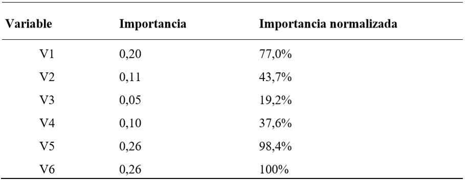 La importancia normalizada es un indicador de la jerarquía de la influencia de las variables predictoras, se obtiene de dividir los valores de importancia por el mayor valor porcentaje de importancia. Lo anterior, también puede utilizarse para evaluar la permanencia de una variable en el modelo, y con esto mejorar su capacidad predictiva.