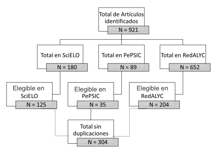 A fin de identificar artículos producidos y publicados por autores latinoamericanos en el campo de la Psicología, los criterios de inclusión adoptados para la selección del material fueron: a) autoría: tener al menos un autor con formación y/o experiencia en el campo de la Psicología y vínculos institucionales latinoamericanos; b) tipo de redacción: contemplando trabajo teórico, informe de investigación empírica o relato de experiencia. Cabe señalar que previamente no se definió un marco temporal para relevo, por lo que el intervalo de años de publicación -1994 a 2021- corresponde al primer caso identificado en las bases utilizadas y al último caso encontrado al momento de la finalización de la colecta de datos (segundo semestre de 2021).