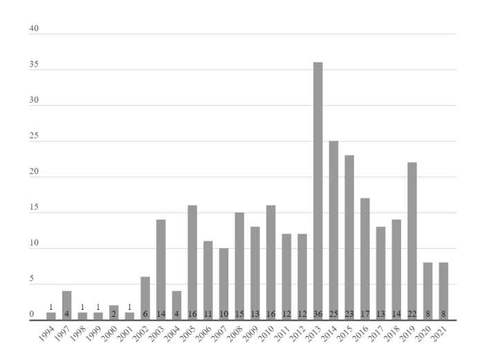 Como se mencionó anteriormente, la distribución temporal de estas publicaciones fue entre los años 1994 (primer caso identificado) y 2021 (año de finalización de la colecta de datos). Al respecto de este período, cabe señalar que entre finales de la década del 90 y principios del 2000 se inició un proceso de transición de las revistas científicas impresas al formato electrónico, impulsados por la expansión del acceso a internet en Latinoamérica. Por lo tanto, el material analizado no refleja con precisión los inicios de esta producción, ya que no abarca publicaciones en versiones exclusivamente impresas de dichas revistas.
