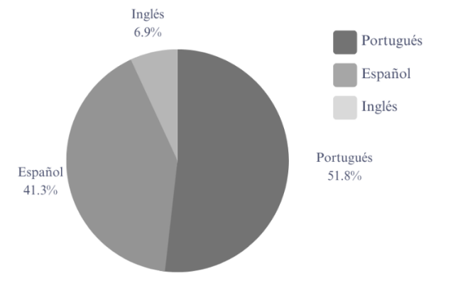 En cuanto al idioma, más de la mitad de esta producción fue realizada en portugués, lo que corresponde al 51,8% del total (N = 158). Seguidamente, las publicaciones en español corresponden al 41,3% (N = 126) y, finalmente, se identificaron 21 publicaciones en inglés, que corresponden al 6,9% de esta producción ( Figura 3).