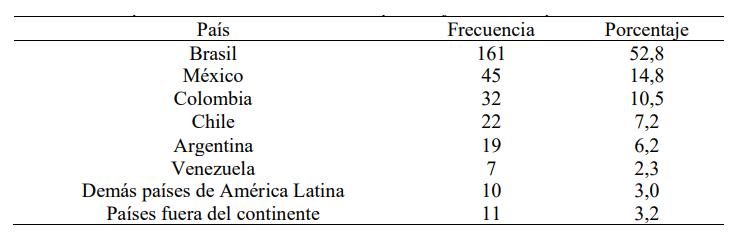 Aunque las mujeres representan la mayor parte de la autoría, aparentemente publican más en coautoría, o de manera menos sistemática. Se destacaron en este relevo de datos: Gislei Mocelin Polli (Brasil) con 5 publicaciones; Ariane Kuhnen (Brasil), Mara Ignes Campos-de-Carvalho (Brasil), Sylvia Cavalcante (Brasil), Esther Wiesenfeld (Venezuela), con 4 publicaciones por autora. Aún es notable la relevancia de la producción de las mujeres brasileñas, ya que cuatro de las cinco mujeres destacadas están vinculadas a este país. Esto también puede reflejar la distribución de la autoría en general, ya que Brasil sigue siendo mayoritario cuando se considera el país donde se vinculan las primeras autorías de los artículos ( Tabla 1).