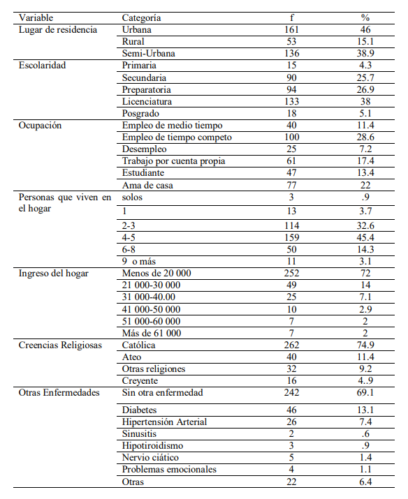 Características de la muestra: la mayoría de los participantes son solteros (34.9%) o viven en unión libre (28.9%), casados (28%), separados (4%) y divorciados (3.4%). En su mayoría viven en una zona urbana (46%), con un grado de estudios de licenciatura (38%), con empleo de tiempo completo (28.6%), el mayor porcentaje vive con 4 personas (28%) y tiene ingresos de menos de 20 000 pesos mensuales (72%) ( ver tabla 1).