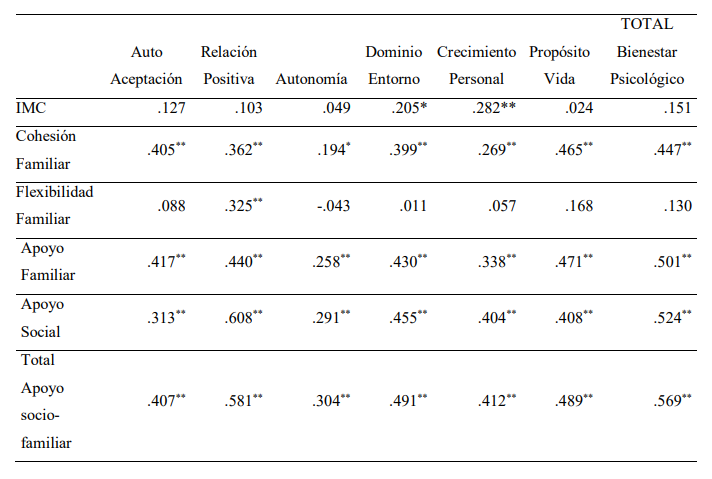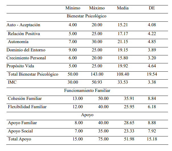 Por otra parte, en la tabla 2 se observa que los factores del bienestar psicológico puntúan con valores medios y altos, siendo propósito en la vida el más alto. En lo que respecta al IMC el promedio de la muestra está en el rango de obesidad tipo I (30-34.9). Por otra parte, en el funcionamiento familiar, en el caso de cohesión familiar, el promedio se encuentra en familia separada (35-40) y en flexibilidad el promedio estuvo en familia flexible (25-28). En el caso del apoyo, tanto el apoyo social, el familiar y el total de apoyo, tiene puntuaciones con tendencias altas, donde el apoyo familiar obtiene el valor superior.