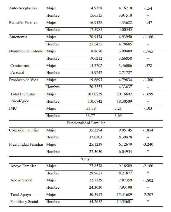Se realizó una comparación entre hombres y mujeres, donde no se presentaron diferencias significativas en el IMC ni en los factores de bienestar psicológico ( ver tabla 3), pero si se encontraron diferencias en los factores de funcionalidad familiar, donde los hombres presentan mayor puntuación en la media. En el caso del apoyo socio-familiar, tanto el apoyo familiar como el apoyo total presentaron diferencias significativas, donde los hombres son los que puntúan más alto.