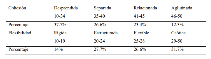 En la tabla 4 se presenta la clasificación de los factores cohesión y flexibilidad de la funcionalidad familiar, en el caso de cohesión la categoría que presenta mayor porcentaje de participantes es la familia desprendida y en el factor de flexibilidad la categoría que presentó mayor porcentaje fue la familia caótica.