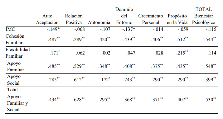 En el caso de los hombres, el IMC presenta correlaciones positivas bajas con los factores dominio del entorno y crecimiento personal. Por su parte, los factores apoyo familiar y total del apoyo socio-familiar fueron los que tuvieron mayor número de correlaciones altas con los factores del bienestar psicológico, especialmente con los factores dominio del entorno, crecimiento personal y propósito de vida ( ver tabla 6).