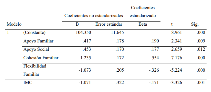 Por último, se realizaron los modelos predictivos para hombres y mujeres. Al analizar el modelo predictivo en las mujeres a través de regresiones lineales múltiples, se obtuvo una R 2= .459 (p= < 0.001), es decir, el 46% de la varianza es explicada por las variables contenidas en el modelo, siendo importante señalar que la cohesión familiar y la flexibilidad familiar son los factores que más explican esta varianza, además que el modelo eliminó el total del apoyo socio-familiar ( ver tabla 7).