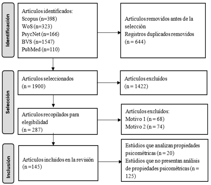 Los criterios adoptados para la inclusión de artículos, considerando el objetivo propuesto, fueron: a) artículos de revisión y empíricos; y b) estudios para medir la carga de trabajo mental por medio de instrumentos psicométricos. El proceso de selección se realizó como se muestra en la Figura 2, siguiendo las normas del protocolo PRISMA 2020, elementos de informe preferidos para revisiones sistemáticas y metaanálisis ( Page et al., 2021). Se utilizó el software de gestión EndNote® para recopilar referencias y eliminar duplicados. Después de la exclusión de los artículos, con base en los criterios mencionados y lectura de los títulos y resúmenes, se leyeron íntegramente 287 artículos y, de estos, 145 fueron elegidos para revisión. Se elaboró una matriz de análisis en una hoja de cálculo de Excel para recolectar información de cada estudio: (1) el instrumento, (2) las dimensiones y (3) las propiedades psicométricas (confiabilidad y validez). Todo el proceso de selección de artículos, así como la extracción de datos, fue realizado de forma independiente por dos investigadores, y las diferencias fueron resueltas con la ayuda de un tercero.
