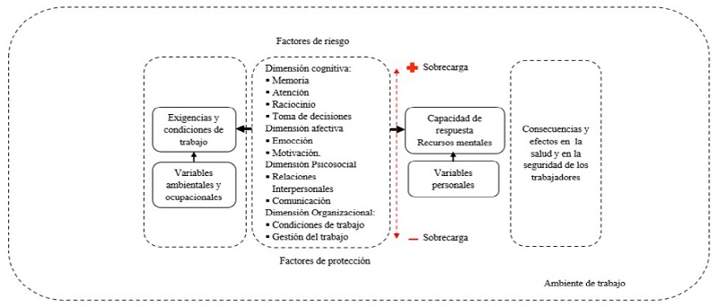 Es posible partir del entendimiento de que la carga mental del trabajo (CMT) es el esfuerzo requerido para realizar actividades laborales, compuesto por la capacidad de respuesta, el grado de exigencia del desempeño y las condiciones de trabajo, afectada por variables individuales, ambientales y ocupacionales, antecedentes o concurrentes de ella ( Frutuoso & Cruz, 2005; Ródio- Trevisan, 2020; Rubio-Valdehita et al., 2017). Puede verse alterado por condiciones, exigencias, presiones y ritmos de trabajo, uso de tecnologías, grado de insalubridad, apoyo externo, motivaciones, experiencias de vida y profesionales del trabajador. Medir la carga mental de trabajo implica asignar un valor al esfuerzo mental requerido para realizar tareas. Un modelo conceptual es presentado en la Figura 1.