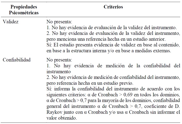 Los criterios utilizados para recopilar la información sobre las propiedades psicométricas se elaboraron de acuerdo con los parámetros internacionales de la AERA (Asociación Americana de Investigación Educativa), APA ( Asociación Americana de Psicología) y NCME (Consejo Nacional de Medición en Educación) (2014), como se muestra en la Tabla 1.