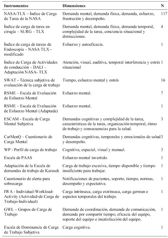 El instrumento más utilizado, identificado en 117 artículos de esta revisión, fue el NASA-TLX (Nasa Task Load Index), además de 6 adaptaciones de este para su uso con públicos específicos. Inicialmente llamado NASA-Ames, este instrumento estaba originalmente compuesto por nueve dimensiones, que reflejaban diferentes escalas, lo que se consideraba poco práctico para su uso en simulaciones o en un entorno operativo. Así, se excluyeron las subescalas consideradas irrelevantes o redundantes con respecto a las cargas de trabajo y, en 1987, se desarrolló una adaptación del instrumento, que pasó a conocerse como NASA-TLX ( Abich et al., 2017; Alberdi et al., 2018; Ceballos-Vásquez et al., 2016). Desde 2001 cuando fue traducido y adaptado para Brasil por el Laboratorio de Factor Humano, de la Universidad Federal de Santa Catarina, ha sido utilizado en estudios de maestría y doctorado, con diferentes objetivos y grupos ocupacionales ( Laurie-Rose et al., 2017; Laurie-Rose et al., 2014).