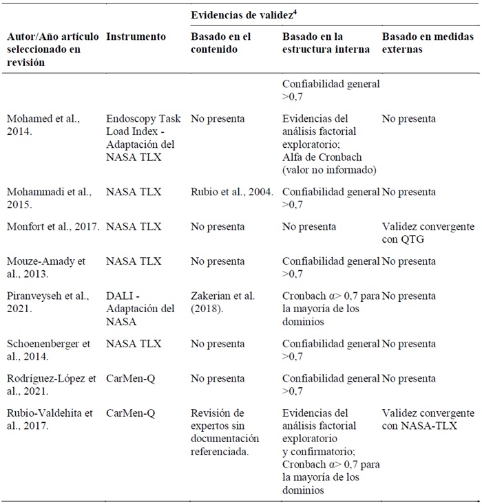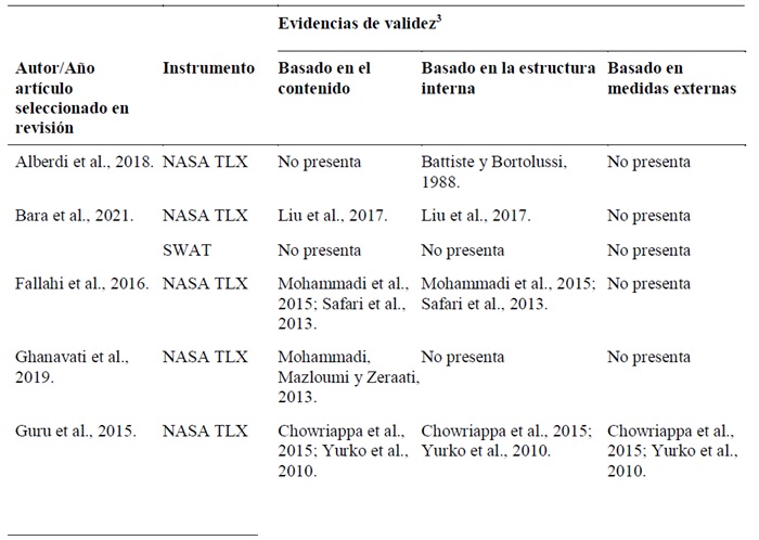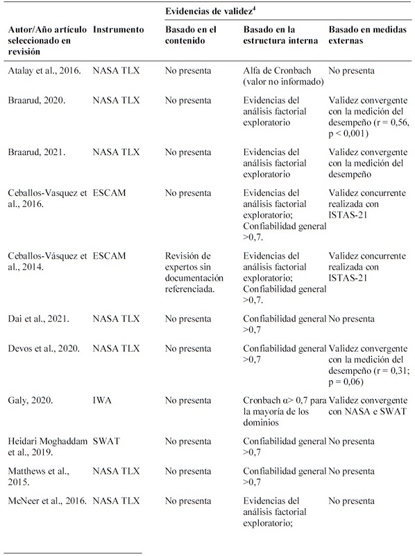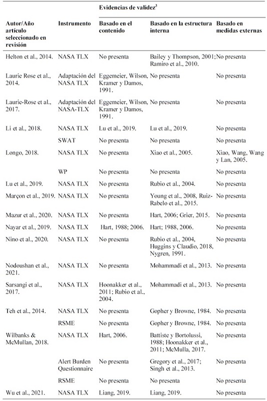 En la literatura se encontraron argumentos de que los resultados obtenidos con la aplicación de NASA-TLX, y algunos de sus derivados, representan medidas válidas y confiables para demandas de tareas y no demandas de trabajo, por lo que es claro que, aun siendo este un método ampliamente utilizado, puede presentar problemas para medir la carga de trabajo mental ( Ba & Zhan, 2011; Bridger & Brasher, 2011). Para Bridger y Brasher (2011), la eliminación de ítems referentes a demandas físicas y rendimiento mejoró la confiabilidad interna del test NASA-TLX, dicho dato refuerza la importancia de evaluar la evidencia de validez y confiabilidad cuando un estudio propone el uso de instrumentos psicométricos. Todos los estudios revisados que indicaron los valores de confiabilidad para los instrumentos utilizados tienen resultados suficientes para afirmar que dichos instrumentos son precisos ( Tabla 4), pero no se puede decir lo mismo de los estudios en los que los valores referentes al análisis estadístico de confiabilidad no fueron proporcionados, lo que se puede observar, en estudios donde la confiabilidad de los instrumentos no fue mencionada.