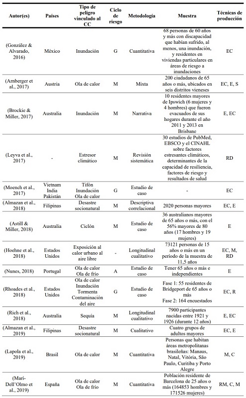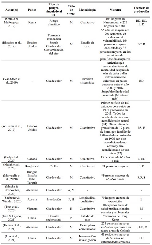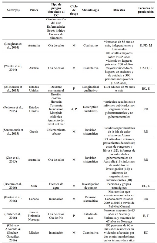 Las investigaciones recientes destacan la necesidad de conocer cómo las personas mayores enfrentan y se preparan ante los procesos de riesgo de desastre y el CC (Sandoval-Díaz et al., 2022; 2023b; Carter et al., 2016). Asimismo, algunos trabajos advierten la limitada capacidad de adaptación y supervivencia de las personas mayores ante condiciones climáticas extremas debido al incremento en las enfermedades, movilidad reducida, aislamiento, exclusión social, y problemas de acceso a servicios sociales y sanitarios ( Chávez-Alvarado & Sánchez-González, 2016).