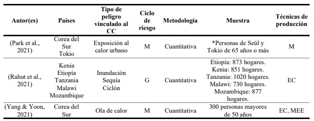 En la Tabla 1 se observa la síntesis de estudios, las cuales se concentran en Australia (9), Estados Unidos (7) e Inglaterra (4), sin embargo, en América Latina y el Caribe, solo se reportan tres investigaciones: México (2) y Brasil (1). Entre los peligros más estudiados se identifican olas de calor y extremos de calor (54%), seguido por las inundaciones (24%), siendo los menos estudiados los asociados a olas de frío e inviernos de frío extremo (8%). Por otro lado, el ciclo de riesgo mayormente estudiado fue el de mitigación 4con un 66%. Por último, los estudios se han desarrollado principalmente a través de metodologías cualitativas (66%) bajo estudios de casos (18%) y revisiones sistemáticas (18%).