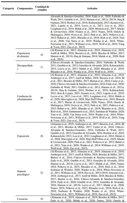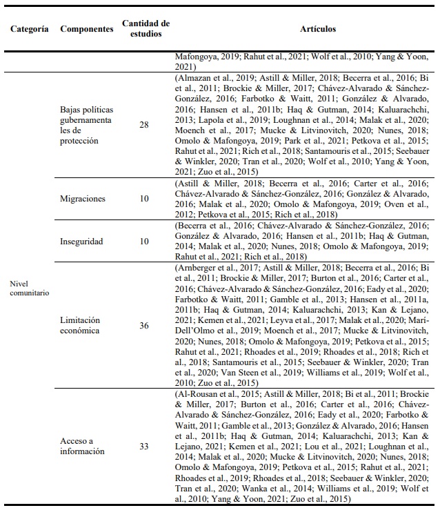 En la Tabla 2 se observa los principales componentes asociados a la vulnerabilidad en personas mayores frente al cambio climático, siendo el más estudiado a nivel social, el aislamiento con 18 estudios (36%), a nivel individual se destacan las conductas de afrontamiento con 49 (98%) y las morbilidades con 40 (80%). A nivel comunitario, que abarca el entorno y las personas más cercanas en el vecindario o comunidad local donde vive la persona mayor, se destacan las limitaciones económicas, con 36 (72%), seguidas por las dificultades en el acceso a la información, con 33 (66%).