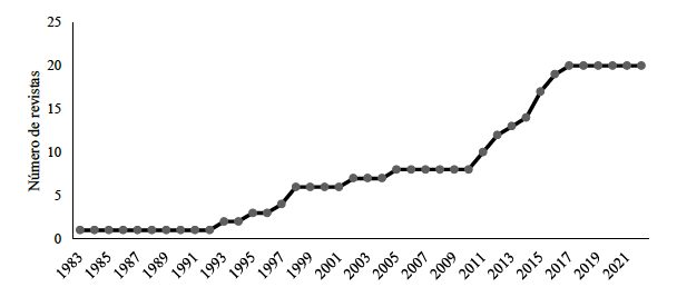 En la Figura 1, se observa el desarrollo de las Revistas de Psicología en el Perú, teniendo el año de 1983 como inicio de las revistas sistematizadas con un código ISSN. Pasaría una década, hasta el año de 1993 para que una segunda revista de psicología sea registrada con un código ISSN. En los próximos 17 años, hasta el año 2010 se editaron un total de 8 revistas. Observado que desde el inicio de la edición de las revistas en el año 1983 hasta el año 2010, solo se editaban 8 revistas de psicología. Teniendo una tasa de crecimiento de 0,29 revistas por año. El mayor crecimiento se inició desde el año 2011 hasta el 2017, donde se incrementa en 12 el número de revistas. En este periodo de tiempo la tasa de crecimiento se incrementó a 2 revistas por año. Llegando a editarse un total de 20 revistas de psicología en el Perú.