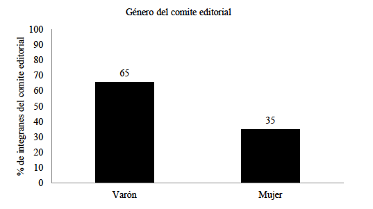 En la Figura 2, se muestra la distribución de los integrantes de los comités editoriales de las revistas según el género. Donde el 65% de los integrantes son del género masculino y el 35% son del género femenino. Se puede resaltar que existe una predominancia del género masculino en la integración de los comités editoriales de las revistas de psicología en el Perú.