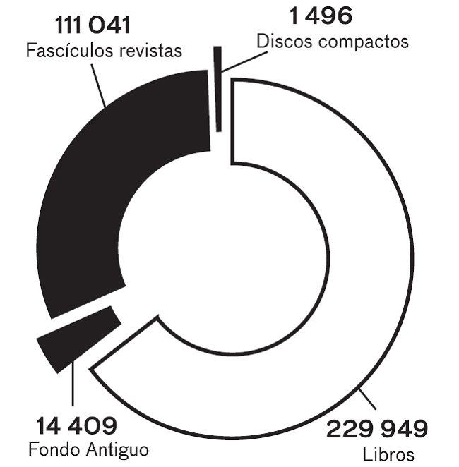 En 2014 atendió a 6 491 usuarios y en 2015 atendió a 5 129 (de los cuales 4 850 fueron usuarios externos y 279 usuarios internos); en 2016 se atendieron 5 449 usuarios.1 El acervo de la Biblioteca está compuesto por las siguientes colecciones: 229 949 volúmenes de libros, 111 041 fascículos de revistas, 14 409 obras del Fondo Antiguo y 1 496 discos compactos, tal y como se detalla en el siguiente gráfico: