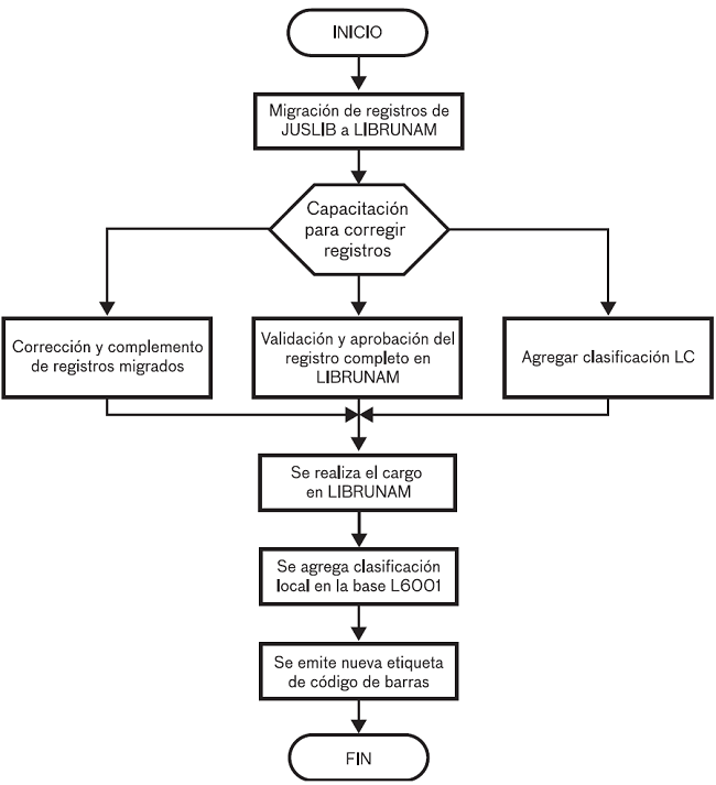 Así, el 17 de noviembre de 2015 se realizó el alta (batch) de 65 846 registros bibliográficos procedentes de la base JUSLIB y se ubicaron en los números de sistema 1792190 al 1858043 de LIBRUNAM. Además, del 23 al 30 de noviembre de 2015, la licenciada Ángeles Ramos Díaz de la DGB impartió, a trece técnicos académicos de la Biblioteca “Dr. Jorge Carpizo”, un curso de 25 horas de duración enfocado en la capacitación para corregir los registros migrados según las normas de MARC21. Así, en enero de 2016, los técnicos académicos comenzaron la revisión y corrección de uno por uno de los 65 846 registros migrados. Una tarea titánica que a la fecha no ha concluido.