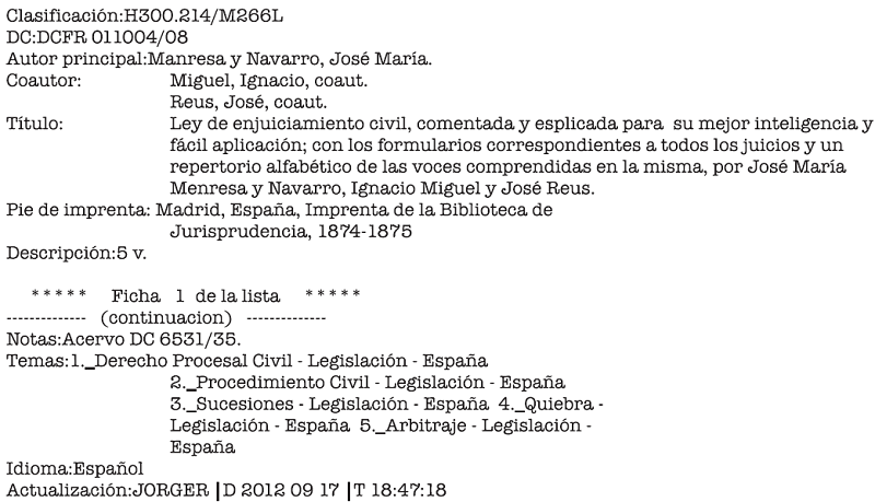 Conscientes de que esta tarea se llevaría mucho tiempo, se solicitó también a la DGB que se incluyeran en la base local de ALEPH del IIJ esos 65 846 registros en su estado provisional, para que los usuarios los pudieran visualizar y así localizar las obras dentro de la estantería.