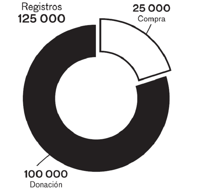 En efecto, la situación que presentaba la base JUSLIB frente a LIBRUNAM era la siguiente: existían alrededor de 125 000 registros en JUSLIB, de éstos, aproximadamente 25 000 correspondían a libros comprados con presupuesto de la UNAM, los cuales estaban registrados en LIBRUNAM y contaban con la clasificación LC; no obstante, alrededor de 100 000 registros concernían a libros adquiridos por donación, mismos que solo tenían un número de adquisición local y únicamente la clasificación propia de la Biblioteca “Dr. Jorge Carpizo”, como se puede ver en el siguiente gráfico.