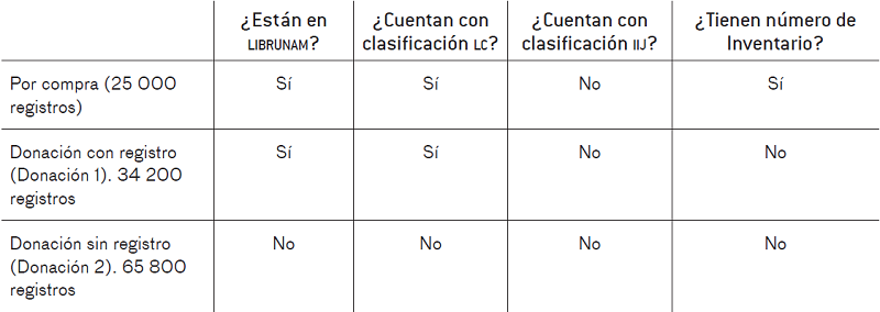 De los tres casos, sin duda, el más complejo fue el de libros por “Donación 2”, ya que implicaba solicitar a la Subdirección Técnica de la Dirección General de Bibliotecas la creación de 65 800 registros nuevos, sumada a las peticiones constantes de catalogación de libros requeridas por todas las bibliotecas de la UNAM.