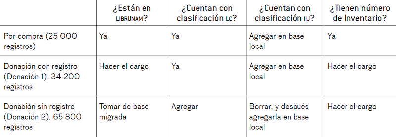 De esta manera, se determinó que serían tres casos de libros a procesar: 1) los 25 000 registros de libros por compra a los que solo había que añadir la clasificación local; 2) los 34 200 registros de libros por donación con registro en la base LIBRUNAM (denominados Donación 1), a los que se tendría que “hacer el cargo”, es decir, incorporar en LIBRUNAM para obtener su número de inventario, y posteriormente añadir clasificación local; y 3) los 65 800 registros de libros de donación sin registro en LIBRUNAM (denominados Donación 2), a los cuales habría que crear todo su registro en LIBRUNAM, agregar clasificación LC y demás datos según normas catalográficas, además de hacer el cargo del ejemplar y agregar clasificación local. En la siguiente página se presenta un cuadro ilustrativo.