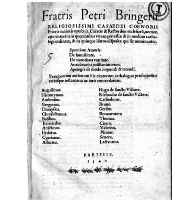 El libro escrito por Bringerii aborda los temas que son útiles para la vida eterna, tales como el amor, la humildad, la vanidad, la debilidad, y contiene una defensa sobre las formas de hablar y el silencio. Fue impreso en la Ex Officina Michaëlis Faezandat, in domo Albretica, è Regione D. Hilarii.