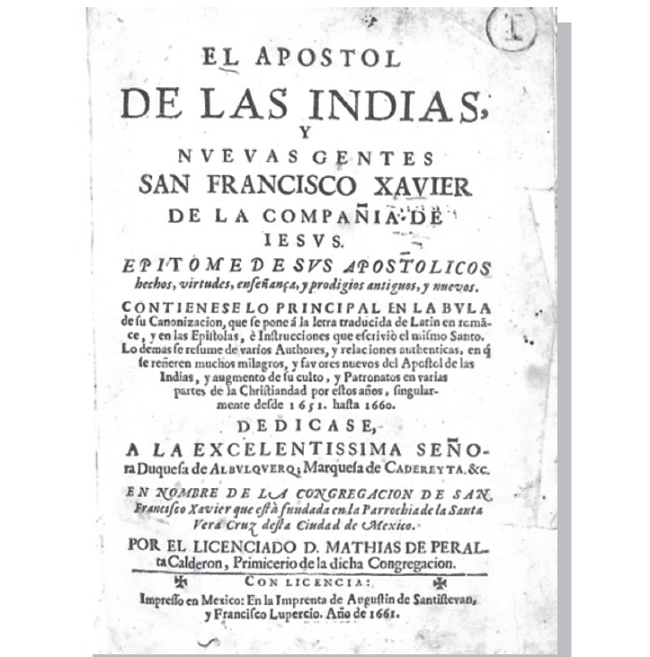 Sin embargo, el libro impreso en México que tenemos ubicado como el más antiguo de nuestro acervo data del año 1661, fue impreso en la imprenta de Agustín de Santisteban y Francisco Lupercio,1 por Mathias de Peralta, y se titula El Apóstol de las Indias, y Nuevas Gentes San Francisco Xavier de la Compañía de Iesus.....