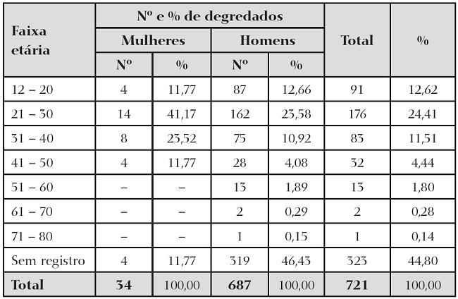 O número integral de registros aponta uma concentração maior de degredados homens (23,58%) e mulheres (41,17%) com idade entre 21 e 30 anos por ocasião das sentenças ou comutações. Também são expressivas as porcentagens de homens jovens entre 12 e 20 anos de idade (12,66%) e de mulheres entre 31 e 40 anos (23,52%).