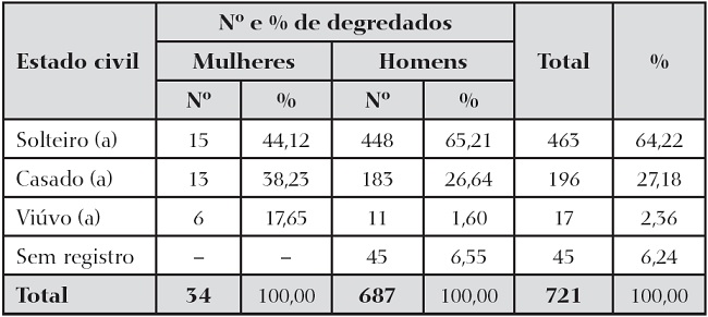 Ao contrário das mulheres, as informações sobre os homens degredados refletem uma enorme disparidade entre o percentual de casados (26,64%) e solteiros (65,21%), sendo a incidência de viúvos (1,60%) a única semelhança em relação ao sexo oposto.