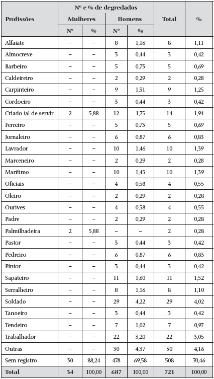 Os soldados aparecem em maior número (4,02%). Muitos foram condenados por deserção, como João Dias, que se encontrava na cadeia de Lisboa "por ter desertado do Real Serviço".66 Os trabalhadores (3,05%), criados (1,94%), sapateiros (1,94%), lavradores (1,53%) e marítimos (1,53%) são as outras profissões registradas com maior porcentagem.