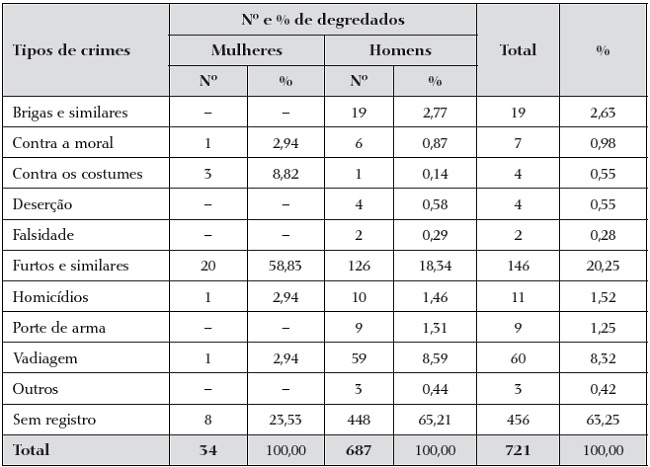 O quadro evidencia que os crimes mais cometidos pelos condenados a degredo na Amazônia portuguesa, tanto pelos homens quanto pelas mulheres, excetuando os não registrados na documentação, foram os do tipo aqui classificado como "furtos e similares" (20,25%), os quais correspondem a furtos, roubos e arrombamentos ou invasão de residências.
