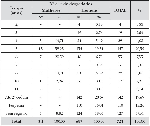 Para o período pesquisado foram recolhidos 721 registros de pessoas degredadas para os estados do Grão-Pará e Maranhão e Grão-Pará e Rio Negro, perfazendo uma média anual de 14,42 pessoas.