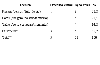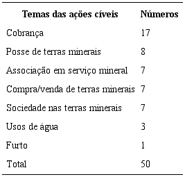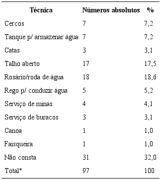 Mesmo assim, na medida em que os direitos difusos dos moradores tinham nos juízes das câmaras uma descrição ou aceitação (escrita), repercutiam nesta instância as suas demandas e os confrontos mais violentos.31 Assim, os casos judiciais (tabela 1), na medida em que compunham os objetos da dissensão cotidiana, revelavam os tópicos das práticas minerárias, como os modos de trabalho, o uso dos instrumentos ou de engenhos (fábricas de minerar) e as técnicas empregadas. Por meio desta documentação foi possível apreender a diversificação das técnicas adaptadas a cada situação (nos ribeiros, tabuleiros, grupiaras), bem como as relações de trabalho dos exploradores locais, as quais envolviam senhores de escravos, homens livres ou libertos pobres e escravos.