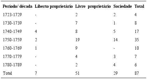 É certo que os mineradores associavam-se quando a situação de exploração obrigava. A sociedade nas terras minerais (apropriação partilhada da data) e a associação em serviço mineral representam 28% dos temas dos litígios das ações cíveis (tabela 3). Provavelmente, a frequência dessas sociedades, relacionadas à intensificação das práticas minerárias e à política fiscal, cresceu na segunda metade do século XVIII.41 Nos livros da administração local das minas, notam-se sociedades em 27,6% das explorações registradas no período 1723-1748 e em 36,2% dos registros do período 1752-1788, com uma grande concentração destas associações na década de 1750. Flávia Reis, por sua vez, verificou que 39,7% dos mineradores da sua amostragem (inventários pós-morte e testamentos das comarcas de Vila Rica e do Rio das Velhas) ligavam-se a alguma sociedade minerária.42
