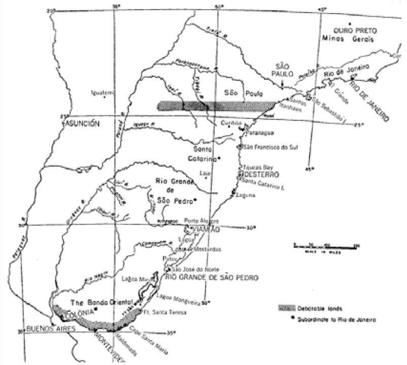 A ocupação do território meridional da América portuguesa consistiu em um misto de ações autônomas de correntes migratórias e de iniciativas patrocinadas pela Coroa. Segundo Dauril Alden, o interesse português no extremo sul teve inicialmente alcance local, passando a regional numa segunda fase e finalmente a imperial.3 Decorre daí o caráter heterogêneo das práticas políticas que progressivamente se direcionaram a uma formalização dada pela maior presença de elementos da administração central, o que acarretou a formação de nichos de poder paralelos, os quais articulavam um misto de autoridades régias e de interesses particulares. Conheçamos um pouco desta evolução, focalizando duas regiões envolvidas na "guerra viva" que engolfou as monarquias ibéricas no extremo sul da América.4 De um lado, a praça militar e mercantil da Colônia do Sacramento que jamais se constituiu em capitania nem sequer teve um conselho municipal que expressasse as demandas das elites locais. De outro, a capitania subalterna do Rio Grande de São Pedro, com sua única vila durante todo o século XVIII, uma remota periferia rural que passou a ser o epicentro dos interesses lusos na passagem para o século XIX.