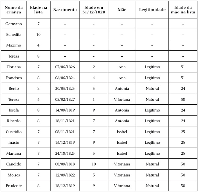 Além das quatro primeiras crianças não localizadas nos registros de batismos,23 a elevada diferença de idade nos quatro cativos seguintes não autoriza seus cômputos nas equivalências entre as duas fontes. Assim, contabilizamos apenas oito crianças com batismo na posse de Vitorino José Lopes, representando 50% dos escravos com menos de 10 anos que ele detinha em 1828. Das mães indicadas contamos outras cinco crianças nascidas entre 1819 e 1828 que não constavam na lista nominativa, cujo destino podemos apenas conjecturar (eventual venda, doação etc.; e, com maior probabilidade, a morte). Sobre a legitimidade das crianças, apenas a escrava Ana aparece com a indicação de casada no rol de moradores de Iguape, não obstante Isabel e Antonia constarem nos assentos paroquiais como casadas com os escravos Joaquim e Francisco, respectivamente.