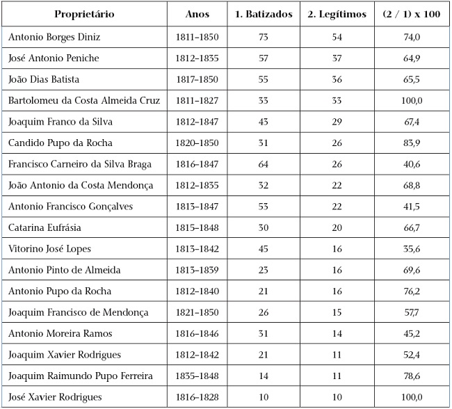 Há que explicitar o contraponto, aqueles não contemplados pelo recorte feito na tabela 1, vale dizer, os escravistas com menos de 10 registros de batismos de crianças escravas legítimas. Assim, os prováveis herdeiros de José Antonio Peniche, Antonio José Peniche e Ana Maria Alves Peniche apareceram, entre 1825 e 1850, em 58 batismos sendo apenas oito legítimos. As cativas do iguapense Silvestre José de Lima, que em 1815 era proprietário de sete escravos, geraram, entre 1811 e 1850, pelo menos 28 crianças, das quais tão-somente três eram legítimas. O lisboeta Francisco de Oliveira Duarte, com nove cativos em 1815, consta como proprietário em 20 assentos entre 1811 e 1844, dos quais 14 eram de ilegítimos. O capitão Bento Pupo de Gouveia, também natural de Iguape, com 14 escravos em 1801, possuía só uma criança legítima entre as 16 batizadas entre 1812 e 1828. A lista poderia se prolongar, mas temos já elementos bastantes para tecer algumas conjecturas sobre o quadro delineado.