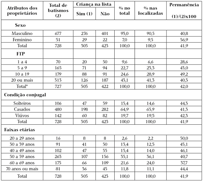 No outro extremo, estão os 23 proprietários de 42 crianças com assentos de batismo não localizados. Apenas oito desses 23 senhores apareceram nos assentos de batismo antes de 1828, sugerindo que a maior parte dos casos seria composta por proprietários novos e as crianças presentes na lista nominativa seriam aquisições realizadas em momentos mais próximos a 1828, ou teriam sido batizadas pelo proprietário anterior (se originárias de doações ou heranças). Também não é possível descartar a possibilidade de o batismo haver ocorrido em outra paróquia, como sucedeu com Joaquim Pereira de Oliveira, originário de Xiririca e morador em Juquiá no ano de 1828. Das oito crianças presentes entre seus 14 escravos, pelo menos quatro foram batizadas na sua paróquia de nascimento.