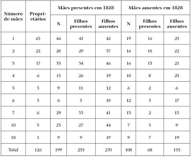 Cabe também um comentário sobre a presença ou não, em 1828, dos pais das crianças batizadas. Dos 728 infantes, contingente objeto dos registros paroquiais, verificamos, na lista nominativa, a presença da mãe em 505 (69,4%) casos; destes, em 235, os filhos estavam também presentes e, em 270, os filhos estavam ausentes. Considerando apenas os legítimos, verificamos a existência do pai em 202 dos 344 casos (em 98 deles coabitavam pai e filhos em 1828).33 Em síntese, viviam com pai e mãe 85 das crianças presentes em 1828. A tabela 5 sintetiza os resultados verificados utilizando as mães como referência de organização dos dados.