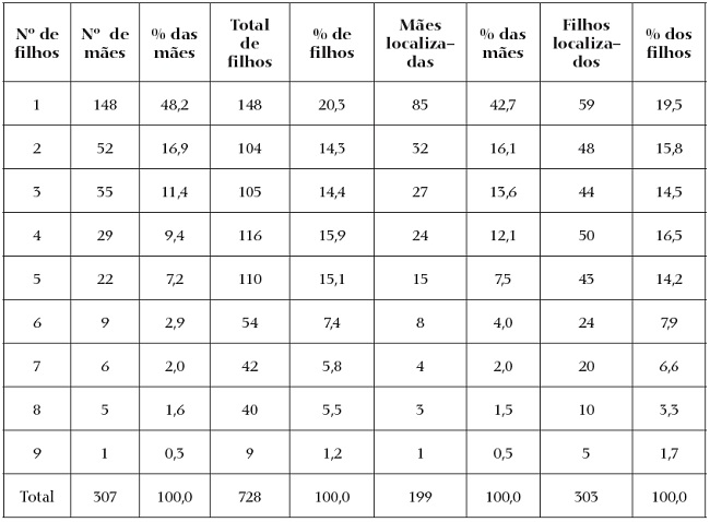 Outra forma de acompanharmos os resultados é a que distribui as mães segundo a quantidade de filhos batizados entre 1811 e 1828. Essa distribuição é fornecida na tabela 6. Praticamente metade das mães apareceu apenas uma vez nos registros de batismos, correspondendo a um quinto do total de assentos. Expandido o grupo para as mães que batizaram até três filhos, atingimos mais de três quartos das mães (76,5%) e cerca de metade do total de registros de batismos (49,0%).36 Se confrontarmos os segmentos "mães com até três filhos" e "mães com mais de três filhos", a permanência das crianças pouco varia (42,3% e 41,0%), porém a localização das mães foi significativamente menor no primeiro grupo (61,3% contra 76,4%).