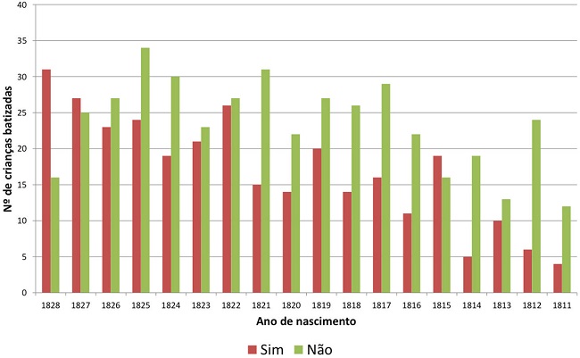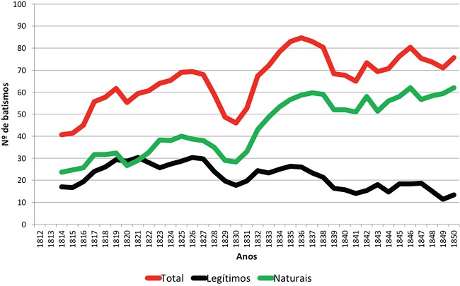 O informe da condição de legitimidade não deixa dúvida sobre a importância das crianças nascidas a partir de uniões sacramentadas pela Igreja até o final da década de 1820: em termos relativos, 43,4%, em média, contra 24,6%, também em média, entre 1831 e 1850. Esse resultado não é original na historiografia. Por exemplo, Márcia Vasconcellos verificou, em Angra dos Reis, no mesmo período, porcentagens um pouco menores de legítimos (cerca de 35,0% entre 1805 e 1837), mas com redução significativa no intervalo 1838-1848, para 23,0%.7 E Sheila de Castro Faria encontrou igualmente, no decorrer dos Oitocentos, "quedas bruscas dos casamentos entre cativos".8