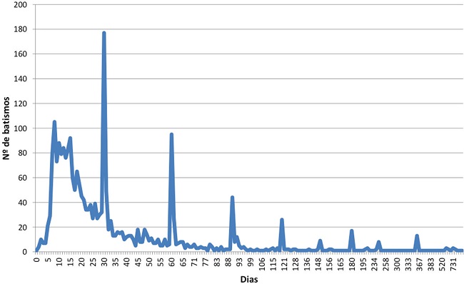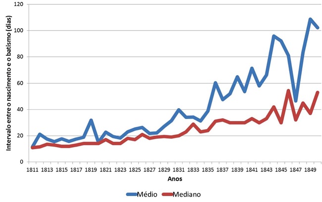 A mesma tendência foi verificada, por exemplo, em Curitiba durante o século XIX, tanto para livres como para escravos. Os autores do estudo sobre a localidade paranaense sugeriram uma nova conformação de hábitos, que envolvia o batismo doméstico como forma de garantir a salvação da alma do recém-nascido e a realização posterior do rito na igreja, justamente privilegiando as "datas redondas". Destacaram, outrossim, que o próprio crescimento da vila colaboraria, aumentando a distância entre o local de nascimento e a igreja, colocando em risco a sobrevivência tanto da mãe quanto da criança.10