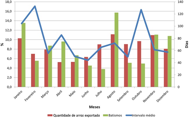 Reforça tal quadro a baixa frequência relativa de batismos nos dois meses antecedentes, sugerindo o "adiamento" dos batismos que normalmente ocorreriam nestes meses para o período de festas em louvor ao Bom Jesus. Outros meses, como janeiro e novembro, também indicam a associação entre o transporte de arroz até a região costeira e a maior ocorrência de batismos. Naturalmente, em outros meses, tal vinculação não é percebida, mantendo-se o fluxo de batismos provavelmente oriundo dos escravistas moradores da própria vila ou em áreas mais próximas.