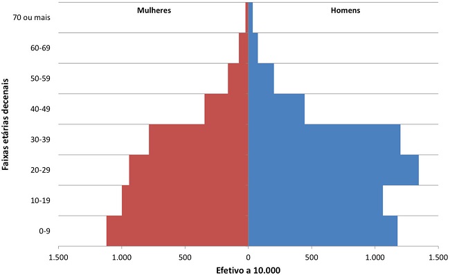 A distribuição etária dos escravos homens e das escravas pode ser observada, segundo faixas decenais, no gráfico 5. Os dois grupos etários mais jovens distinguiam-se dos demais pelo relativo equilíbrio entre os sexos. Nas faixas etárias de 20 a 49 anos, a predominância masculina vinculava-se decerto à opção de compra preferencial e, também, em alguma medida, à provável concentração da morte materna entre as mulheres no aludido segmento etário.14 A partir dessa distribuição por idades, calculamos a relação entre crianças escravas de 0 a 9 anos e mulheres cativas de 15 a 49 anos, igual a 894 crianças para 1.000 mulheres (ou 449, se computadas crianças de 0 a 4 e mulheres de 15 a 44 anos).15